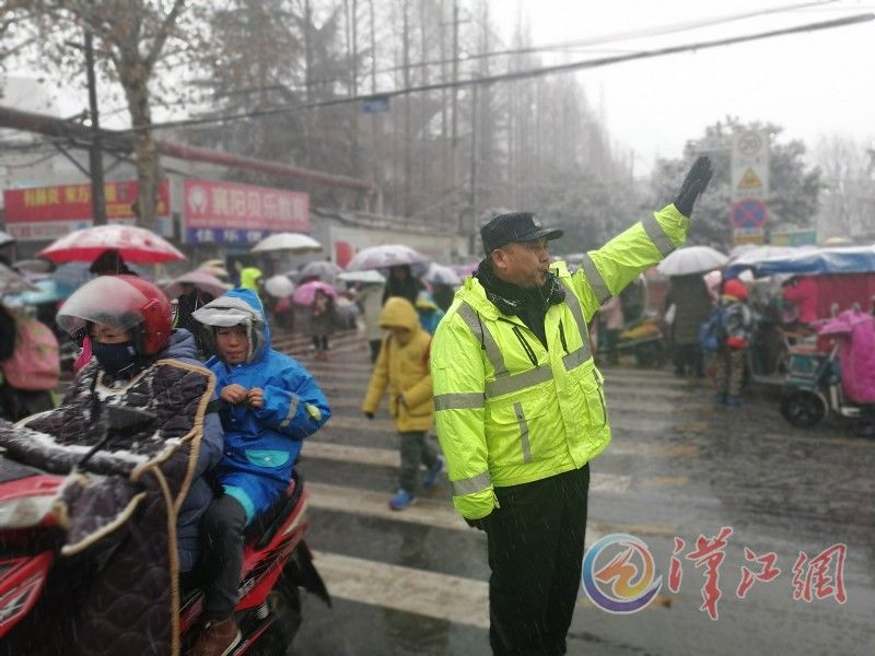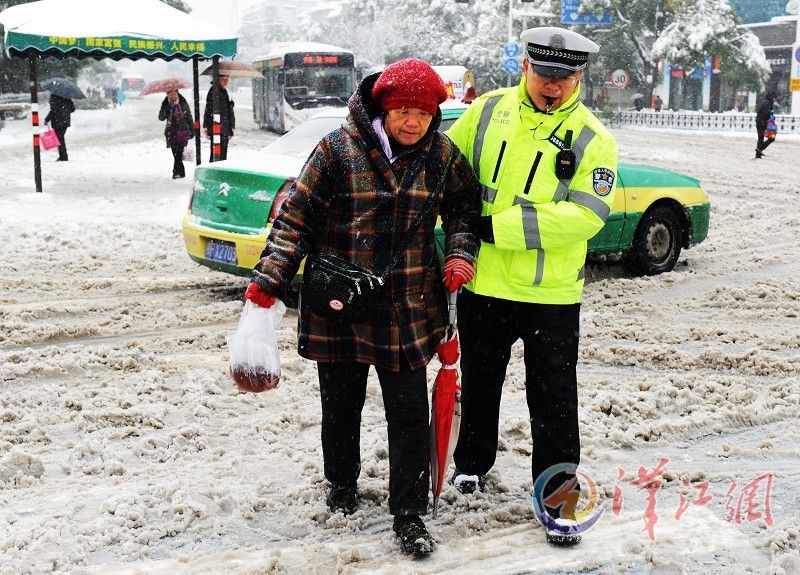 4日上午,襄城鼓楼警务平台一名民警在风雪中搀扶一名老人过马路。