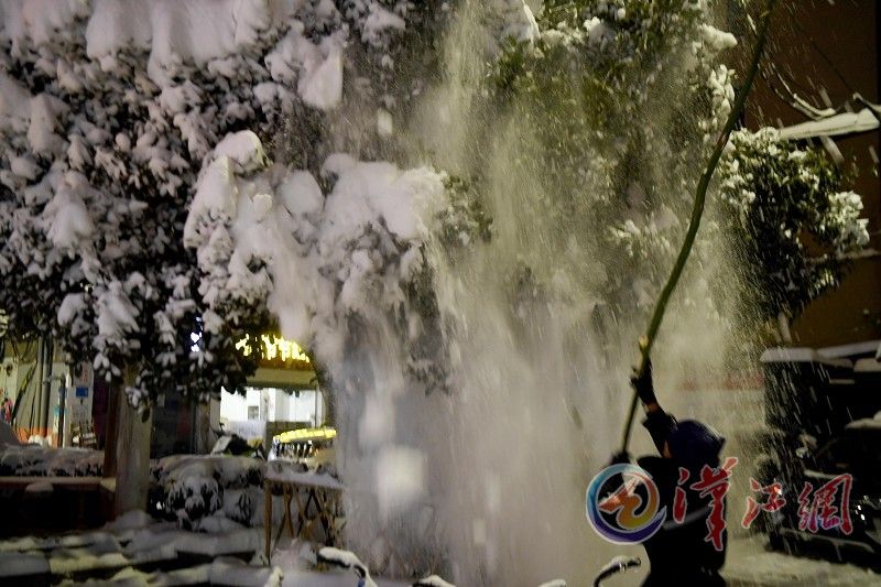 1月4日晚,在襄城北街,一名市民在清理树木积雪,确保树木安全,同时保障市民出行安全。