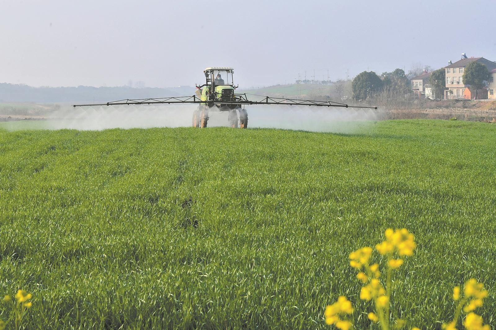 3月3日,气温回升,在位于襄城区尹集乡木桥村的襄阳丰富美农业科技有限公司麦田里,农民利用大型植保机进行小麦田间管理,为夏粮丰收打下坚...