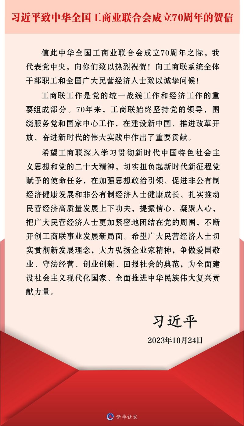 在中华全国工商业联合会成立70周年之际,中共中央总书记、国家主席、中央军委主席习近平发来贺信,代表党中央致以热烈祝贺。