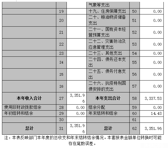 2020年度收支决算总计3351.96万元,较上年度增加3323.91万元,增长11.06%,较年初预算数增加28.06万元,增长0.93%。较上年增长的原因是宣传部强化项目资金管理,提高了项目预算的执行力。本年收支决算基本与年初预算持平。