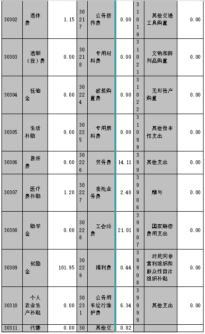 办公费9.67万元、印刷费6.14万元、手续费0万元、水费0万元、电费0万元、邮电费2.84万元、取暖费0万元、物业管理费0万元、差旅费5.94万元、维修(护)费0.85万元、租赁费0万元、会议费1.29万元、培训费0万元、公务接待费1.35万元、专用材料费0万元、劳务费14.10万元、委托业务费2.4万元、工会经费21.01万元、福利费1.28万元、公务用车运行维护费6.34 万元、其他交通费用0.82万元、税金及附加费用0万元、其他商品和服务支出1.06万元、办公设备购置0.39万元、专用设备购置0万元。