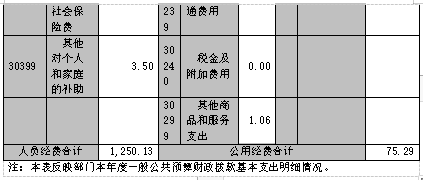 2020年度财政拨款基本支出1325.43万元,其中:人员经费1130.09万元,主要包括:基本工资、津贴补贴、奖金、伙食补助费、绩效工资、机关事业单位基本养老保险缴费、职业年金缴费、职业基本医疗保险缴费、公务员医疗补助缴费、其他社会保障缴费、住房公积金、医疗费、其他工资福利支出、离休费、退休费、抚恤金、生活补助、医疗费补助、奖励金;公用经费74.9万元,主要包括:办公费、印刷费、咨询费、手续费、水费、电费、邮电费、取暖费、物业管理费、差旅费、因公出国(境)费、维修(护)费、租赁费、会议费、培训费、公务接待费、专用材料费、劳务费、委托业务费、工会经费、福利费、公务用车运行维护费、其他交通费用、税金及附加费用、其他商品和服务支出、办公设备购置、专用设备购置。