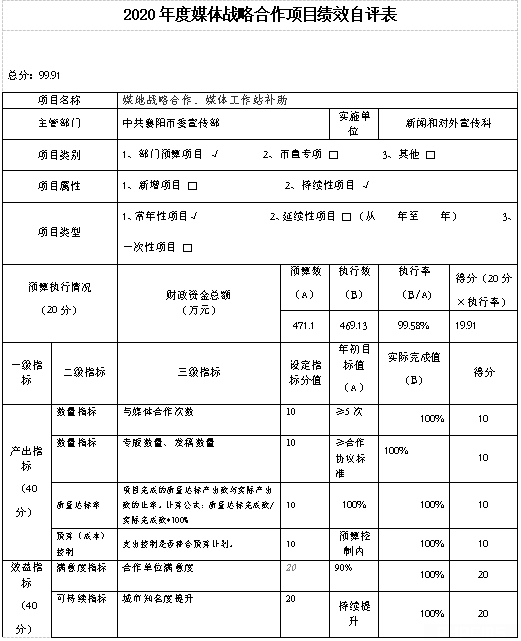 2、媒地战略合作、媒体工作站补助绩效自评综述:全年预算数为471.10万元,执行数为469.13万元,完成预算的99.58%。主要产出和效果:重大主题活动宣传报道有力,紧紧聚焦市委市政府中心工作,服务全省改革发展大局,放大正面宣传声势,夯实主流舆论根基,把牢正确舆论导向,增强对外宣传力度,为谱写新时代襄阳高质量发展新篇章营造积极舆论氛围。发现的问题:考核指标体系不够全面,该项目涉及业务广,部分指标针对性不强,实际考评难度大。下一步改进的措施:业务科室紧紧围绕职能职责和下一年度工作计划,全面梳理各项重点工作,采取定量和定性相结合的办法,对项目绩效目标和指标进行认真研究和论证,确保各项目标和指标指向明确、合理可行,可量化、可实现、可监控、可考评。