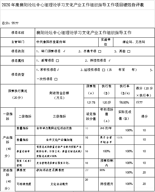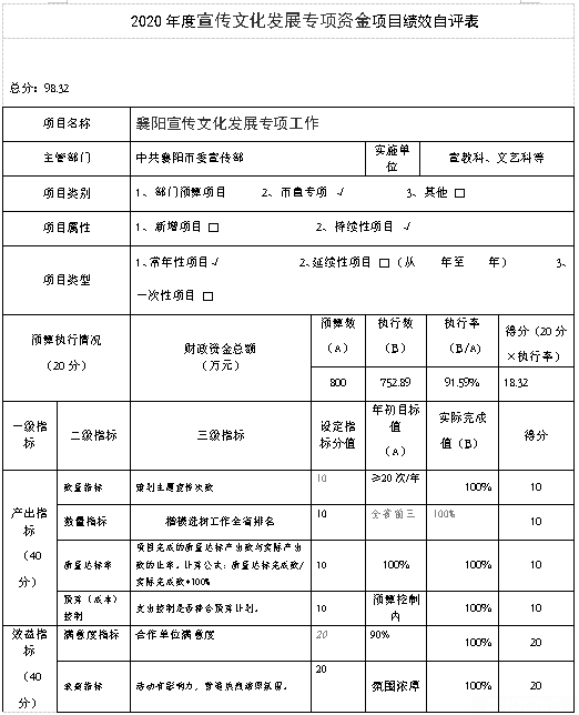 3、宣传文化发展专项资金项目绩效自评综述:全年预算数为800万元,执行数为752.89万元,完成预算的91.59%。主要产出和效果:一是围绕市委、市政府中心工作,策划实施“坚决打赢疫情防控阻击战”、“千名干部进千企”、“决胜全面小康 决战脱贫攻坚”、“汉江大保护禁捕退捕”、“优化营商环境”、“弘扬伟大抗疫精神”、“十三五·靓看襄阳”等30多项重大主题宣传。二是主动对接中央驻汉媒体,精心策划并组织实施了高质量发展、绿色发展、脱贫攻坚等10多个重大主题宣传,取得连续4次“一日三上央视新闻”的重大突破,中省主流媒体(不含网络及新媒体平台)刊播涉襄重点稿件1736 篇(条、次),学习强国学习平台累计刊发涉襄稿件2486篇。三是围绕市委、市政府中心工作及时做好新闻发布工作,全年举办110场新闻发布会,其中,疫情防控期间68场,发布的场次、频率位居全省第一,得到省委宣传部肯定。四是深化社会主义核心价值观建设,举办襄阳市抗击新冠肺炎疫情表彰大会、全市抗击新冠肺炎疫情先进事迹报告会、全市抗击新冠肺炎疫情主题展、“榜样的力量”—2019“襄阳楷模”致敬礼活动、襄阳市百万师生“同上一堂思政课”等大型活动,强信心、暖人心、聚民心。举办2020年襄阳市文化科技卫生“三下乡”集中服务活动,扎实开展“我们的节日”主题活动、“双读”活动,在爱教基地举办20多场核心价值观主题教育活动,在全市开展30多场全民国防教育活动。五是开展全民阅读活动,推进学习型社会建设,举办了2020年“书香溢襄阳”全民阅读活动“云启动”仪式、纪念孔子诞辰2571周年全民阅读活动。组织开展全民阅读示范基地和优秀项目评选活动。全市评选出22个全民阅读示范基地和8个全民阅读优秀项目。发现的问题:项目经费的拨付及时性不强,易导致项目启动时间滞后,项目实施时间紧张,影响实施效果。下一步改进的措施:完善工作方案和经费拨付计划,针对重要时间节点,提前制定计划安排表,做到经费划拨与项目开展无缝对接,切实发挥专项经费的有效保障作用。