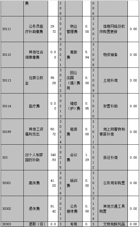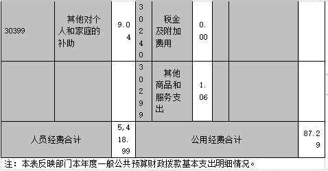 2020年度财政拨款基本支出5506.28万元,其中:人员经费5418.99万元,主要包括:基本工资、津贴补贴、奖金、伙食补助费、绩效工资、机关事业单位基本养老保险缴费、职业年金缴费、职业基本医疗保险缴费、公务员医疗补助缴费、其他社会保障缴费、住房公积金、医疗费、其他工资福利支出、离休费、退休费、抚恤金、生活补助、医疗费补助、奖励金;公用经费87.29万元,主要包括:办公费、印刷费、咨询费、手续费、水费、电费、邮电费、取暖费、物业管理费、差旅费、因公出国(境)费、维修(护)费、租赁费、会议费、培训费、公务接待费、专用材料费、劳务费、委托业务费、工会经费、福利费、公务用车运行维护费、其他交通费用、税金及附加费用、其他商品和服务支出、办公设备购置、专用设备购置。