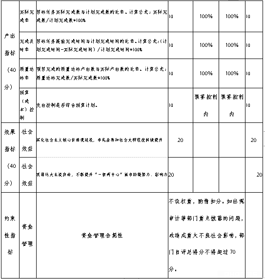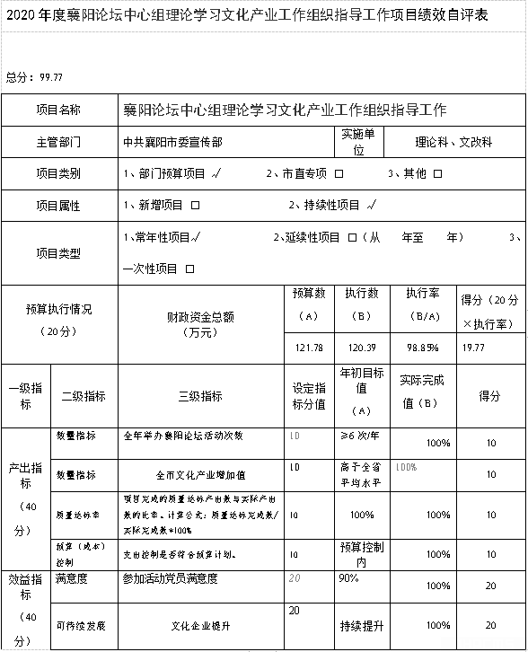 4、襄阳论坛中心组理论学习文化产业工作组织指导工作专项绩效自评综述:全年预算数121.78万元,预算执行数120.39万元,完成预算的98.85%。主要产出和效果:一是着力提高理论武装水平,组织市委理论学习中心组集中学习28次,举办“襄阳论坛”8期;编发《党委(党组)理论学习中心组学习参考》10期;在市直机关开展“学习强国”知识竞赛活动,得到了中宣部、省委宣传部的肯定。二是不断提升理论宣讲实效,策划“襄理襄情”微宣讲,开设“襄理襄情”微理论专栏、微视频专栏,刊发刊播宣讲理论文章和微视频,提升理论宣讲的亲和力、感染力。三是深入开展理论研究,组织各级党委(党组)中心组广泛开展“攻坚年”大调研活动,共收到调研成果228篇,评选出一等奖5篇、二等奖10篇、三等奖15篇。四是文化改革发展稳步推进。深化襄阳日报社、襄阳广播电视台改革,扎实推进媒体融合、完善法人治理结构。持续抓好县级融媒体中心建设。制定《襄阳市文化产业发展奖补资金实施细则》,对接中央支持湖北一揽子政策,争取80多个国家、省级项目,金额达2亿多元。全市规上文化企业达到296家,比去年同期的261家增加35家。下一步改进的措施:提高预算编制的科学性,提升绩效指标设定的精确度。