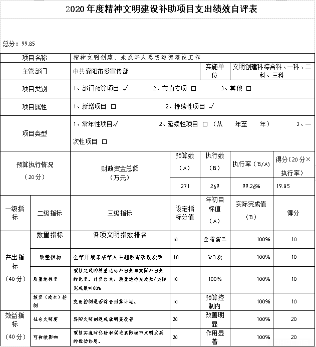 1.精神文明创建、未成年人思想道德建设工作经费项目绩效自评综述:全年预算数为271万元,执行数为269万元,完成预算的99.26%。主要产出和效果:一是深入推进五大文明创建,2020年新增全国文明单位7家、全国文明村8个,坚持以人民为中心的创建导向,整治“十小”不文明行为8.3万余次,推动100多项创建惠民项目有效实施,广大市民创文满意率由95.96%上升到98.05%。二是全年开展道德讲堂总堂活动130多场,各级文明单位开展活动1500多场,受众达26万人次。三是深化未成年人思想道德建设,深化“扣好人生第一粒扣子”主题教育实践活动,开展清明网上祭英烈活动、“童心向党”经典诵读活动、“童心助力 共建美丽中国”童谣征集活动、“家风家训我来拍”短视频征集活动、“小手拉大手”视频传播活动。四是扎实开展 “万名志愿者共创文明城”、“我是新时代雷锋传人”、“清明时 文明风”“端午话家风”等志愿服务活动和网络文明传播活动,开展创文志愿服务2万次,参与志愿者100余万人次。发现的问题:社会文明程度等指标可量化程度低,难以有效评价。下一步改进的措施:对定性指标要详细描述考核标准,确保指标可量化、可考评。