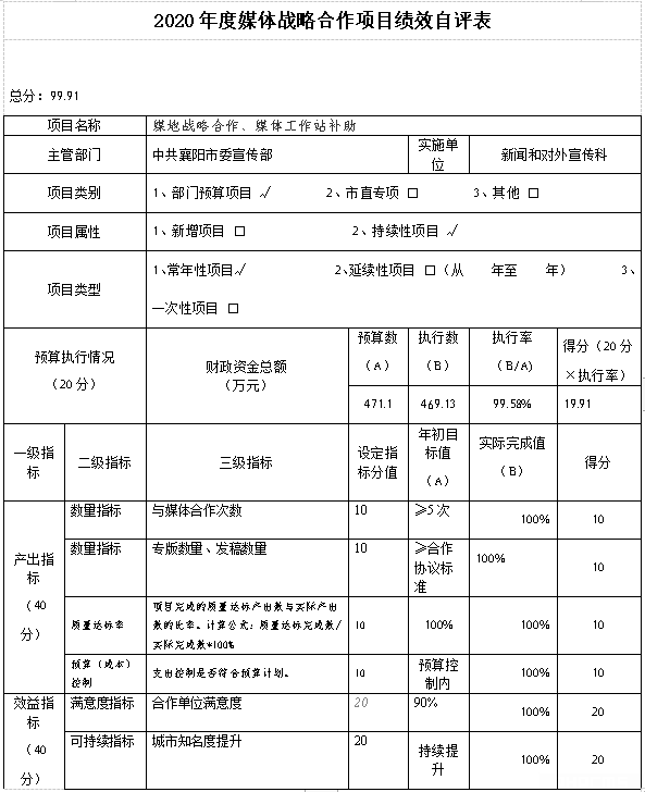 2、媒地战略合作、媒体工作站补助绩效自评综述:全年预算数为471.10万元,执行数为469.13万元,完成预算的99.58%。主要产出和效果:重大主题活动宣传报道有力,紧紧聚焦市委市政府中心工作,服务全省改革发展大局,放大正面宣传声势,夯实主流舆论根基,把牢正确舆论导向,增强对外宣传力度,为谱写新时代襄阳高质量发展新篇章营造积极舆论氛围。发现的问题:考核指标体系不够全面,该项目涉及业务广,部分指标针对性不强,实际考评难度大。下一步改进的措施:业务科室紧紧围绕职能职责和下一年度工作计划,全面梳理各项重点工作,采取定量和定性相结合的办法,对项目绩效目标和指标进行认真研究和论证,确保各项目标和指标指向明确、合理可行,可量化、可实现、可监控、可考评。