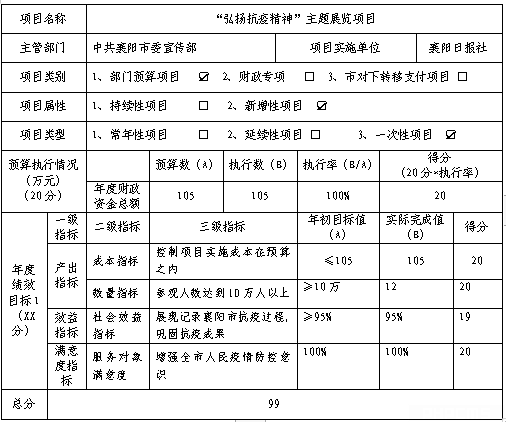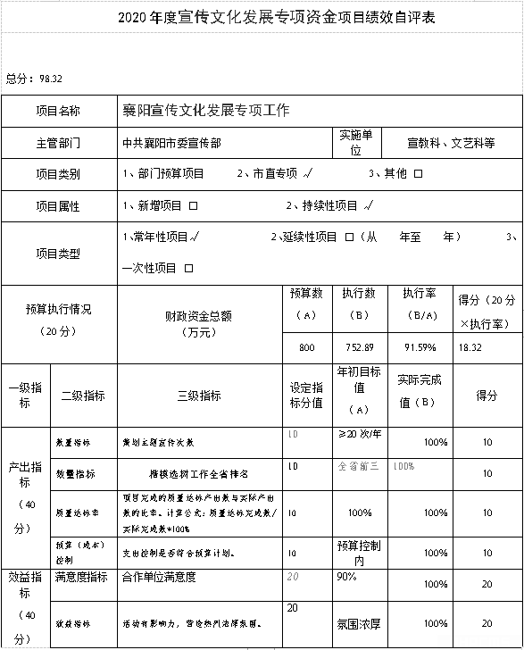 3、宣传文化发展专项资金项目绩效自评综述:全年预算数为800万元,执行数为752.89万元,完成预算的91.59%。主要产出和效果:一是围绕市委、市政府中心工作,策划实施“坚决打赢疫情防控阻击战”、“千名干部进千企”、“决胜全面小康 决战脱贫攻坚”、“汉江大保护禁捕退捕”、“优化营商环境”、“弘扬伟大抗疫精神”、“十三五·靓看襄阳”等30多项重大主题宣传。二是主动对接中央驻汉媒体,精心策划并组织实施了高质量发展、绿色发展、脱贫攻坚等10多个重大主题宣传,取得连续4次“一日三上央视新闻”的重大突破,中省主流媒体(不含网络及新媒体平台)刊播涉襄重点稿件1736 篇(条、次),学习强国学习平台累计刊发涉襄稿件2486篇。三是围绕市委、市政府中心工作及时做好新闻发布工作,全年举办110场新闻发布会,其中,疫情防控期间68场,发布的场次、频率位居全省第一,得到省委宣传部肯定。四是深化社会主义核心价值观建设,举办襄阳市抗击新冠肺炎疫情表彰大会、全市抗击新冠肺炎疫情先进事迹报告会、全市抗击新冠肺炎疫情主题展、“榜样的力量”—2019“襄阳楷模”致敬礼活动、襄阳市百万师生“同上一堂思政课”等大型活动,强信心、暖人心、聚民心。举办2020年襄阳市文化科技卫生“三下乡”集中服务活动,扎实开展“我们的节日”主题活动、“双读”活动,在爱教基地举办20多场核心价值观主题教育活动,在全市开展30多场全民国防教育活动。五是开展全民阅读活动,推进学习型社会建设,举办了2020年“书香溢襄阳”全民阅读活动“云启动”仪式、纪念孔子诞辰2571周年全民阅读活动。组织开展全民阅读示范基地和优秀项目评选活动。全市评选出22个全民阅读示范基地和8个全民阅读优秀项目。发现的问题:项目经费的拨付及时性不强,易导致项目启动时间滞后,项目实施时间紧张,影响实施效果。下一步改进的措施:完善工作方案和经费拨付计划,针对重要时间节点,提前制定计划安排表,做到经费划拨与项目开展无缝对接,切实发挥专项经费的有效保障作用。