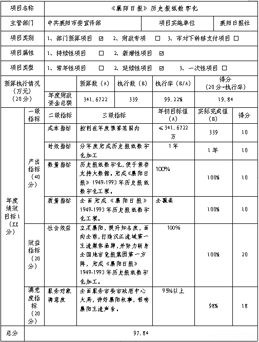 5、襄阳日报数字报刊内容公共服务应用平台项目及襄阳日报数字报史馆项目绩效自评综述:项目全年预算数为341.6722万元,执行数为339万元,完成预算99.22%。主要产出和效益:一是分年度完成历史报纸数字化加工;二是全面完成《襄阳日报》1949-1993年历史报纸数字化工程。发现的问题及原因:一是项目跨度时间长;二是数字化加工版数内容较多,扫描、录入、检索程序复杂。下一步改进措施:一是按照合同约定的时间要求与第三方承接公司尽快完成前期事项;二是运用好报纸数字化所呈现的内容为襄阳经济建设做好服务。
