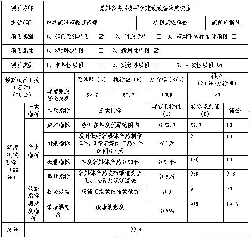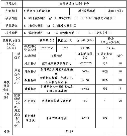 6、全国党媒公共服务平台项目绩效自评综述:项目全年预算数为257.7550万元,执行数为257万元,完成预算99.71%。主要产出和效益:一是党媒平台宣传覆盖区域为全国及汉江流域,及时做好新闻宣传报道推送;二是获得国家级或省级荣誉。发现的问题及原因:媒体深度融合不够,在思想观念融合、纸媒与新媒体融合、采编流程融合等方面还有差距。下一步改进措施:加强对外交流学习,向中央、省级媒体对标看齐,在汉江流域融媒体工作室基础上,扩大襄阳影响力,真正做到汉江流域中心城市地位。