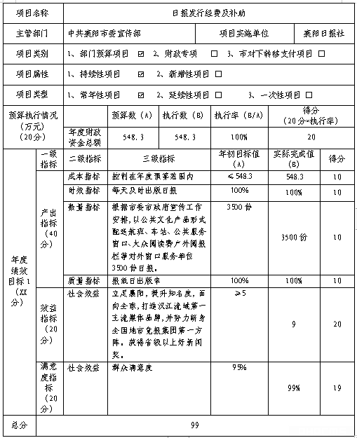 7、日报发行经费及补助项目绩效自评综述:项目全年预算数为548.3万元,执行数为548.3万元,完成预算100%。主要产出和效益:一是根据市委市政府宣传工作安排,以公共文化产品形式配送航班、车站、公共服务窗口、大众阅读费户外阅报栏等对外窗口服务单位3500份日报;二是立足襄阳,提升知名度,面向全球,打造汉江流域第一主流媒体品牌,并努力跻身全国地市党报集团第一方阵。获得省级以上好新闻奖。发现的问题及原因:一是绩效目标全面完成;二是依托襄阳日报社现有的采编、发行和印刷体系,宣传党的方针、路线、政策,贯彻落实报道中央、省、市中心工作,坚持党管媒体,坚持正确舆论导向,做好宣传报道。增强报纸发行覆盖率,让党的声音在基层得到贯彻落实,同时搞好窗口服务,用“三贴近”的原则打造襄阳日报的公信力。下一步改进措施:继续确保报纸的按时出版,出版率达到100%。及时投送3500份日报到航班、车站、公共服务窗口、大众阅读费户外阅报栏等对外窗口服务单位,更好的服务“一极两中心”建设,守牢舆论宣传阵地,把市委、市政府的声音及时传达到基层单位,讲好襄阳故事,唱响襄阳主旋律。