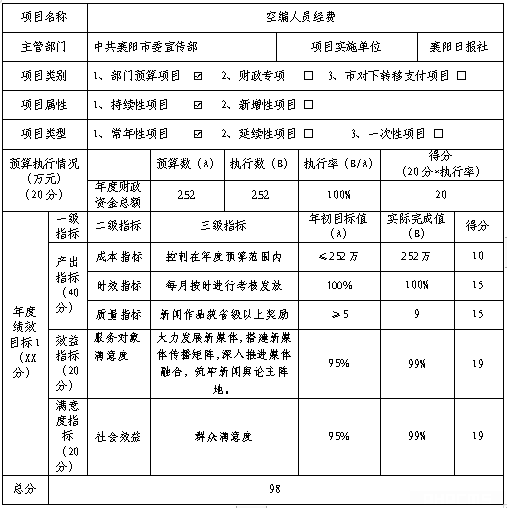 8、空编人员(聘用人员)经费项目绩效自评综述:项目全年预算数为252万元,执行数为252万元,完成预算100%。主要产出和效益:一是新闻作品获省级以上奖励;二是大力发展新媒体,搭建新媒体传播矩阵,深入推进媒体融合,筑牢新闻舆论主阵地。发现的问题及原因:围绕建设一流党媒、进入全国同类城市党报第一方阵的目标,加快构建全媒体传播体系。开展全媒体采编调度指挥中心提档升级项目建设,加快采编流程再造,推动媒体深度融合。突出移动优先,强化技术引领,促进精品生产,积极冲刺全国新闻奖。下一步改进措施:加强采编业务人员的知识培训,多出精品力作,力争超额完成国家、省新闻奖。