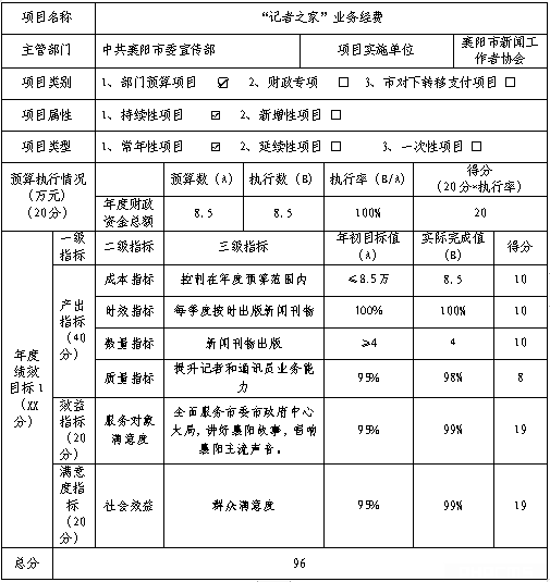 9、“记者之家”业务经费项目绩效自评综述:项目全年预算数为8.5万元,执行数为8.5万元,完成预算100%。主要产出和效益:一是全面服务市委市政府中心大局,讲好襄阳故事,唱响襄阳主流声音;二是每季度按时出版新闻刊物,提升记者和通讯员业务能力。发现的问题及原因:通讯员新闻写作能力有待提高。下一步改进措施:加大全市通讯员的新闻写作能力培训,提升通讯员的稿件质量,运用好微视频、微电影,在新媒体上得到广泛运用,要有基层新闻作品在省级媒体上获得奖项。