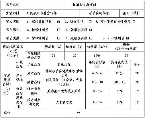 10、精准扶贫看襄阳项目绩效自评综述:项目全年预算数为22万元,执行数为22万元,完成预算100%。主要产出和效益:一是刊发稿件300余篇,专版40余版;二是展示襄阳脱贫攻坚成果。发现的问题及原因:全国较有影响力的《中国农民报》上,刊发刊数较少。下一步改进措施:围绕乡村振兴建设上,用镜头、笔头记录襄阳的成果。