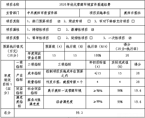 11、2020年优化营商环境宣传报道经费项目绩效自评综述:项目全年预算数为15万元,执行数为15万元,完成预算100%。主要产出和效益:一是刊发日报、晚报专版4个;二是展示襄阳一流营商环境。发现的问题及原因:在新闻策划和向上推送宣传报道上还存在不足。下一步改进措施:将运用好人民日报全国党媒公共平台,刊发更多的在招商引资、项目建设的营商环境上的宣传报道。