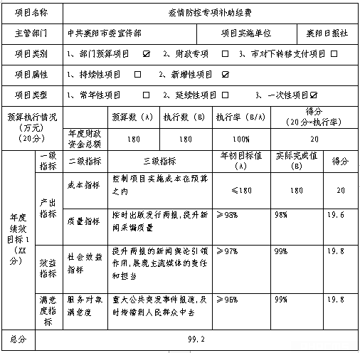 13、疫情防控专项补助经费项目绩效自评综述:项目全年预算数为180万元,执行数为180万元,完成预算100%。主要产出和效益:一是按时出版发行两报,提升新闻采编质量;二是提升两报的新闻舆论引领作用,展现主流媒体的责任和担当,重大公共突发事件报道,及时传播到人民群众中去。发现的问题及原因:疫情来临突然,人民缺乏重大公共安全事件中的应对能力。下一步改进措施:将作为一项常态化工作,深入机关、企事业单位、社区,继续加大疫情防控的宣传报道。同时在《襄阳日报》、《襄阳晚报》及微信客户端上宣传防疫知识,保障重大公共突发事件应急传播,主动发挥党媒责任担当。