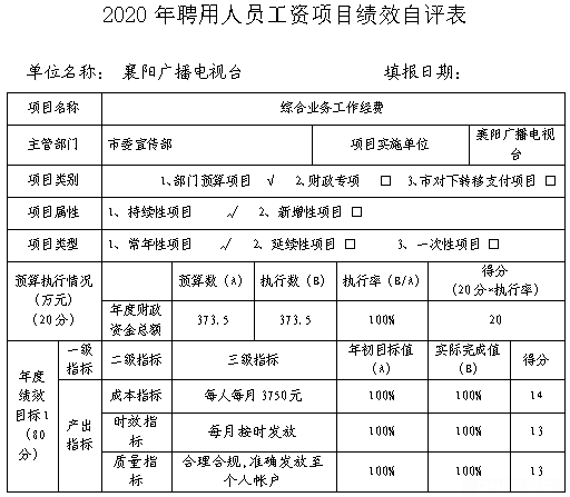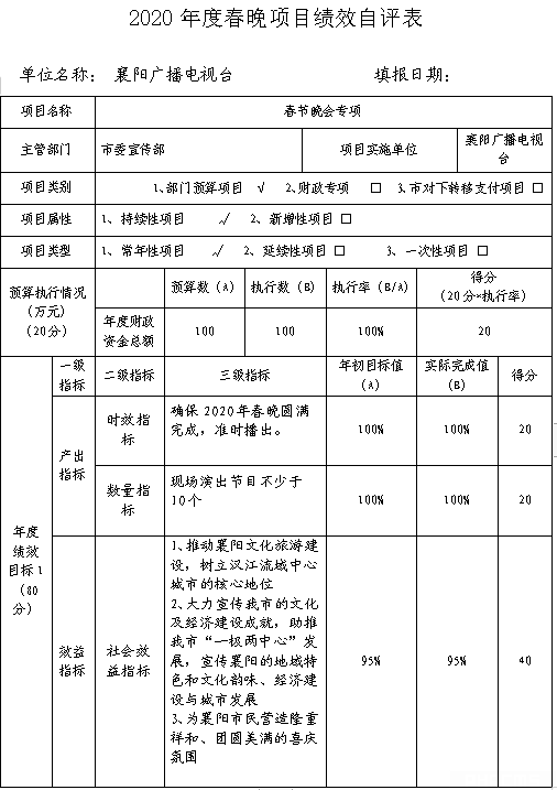 15、襄阳广播电视台春晚经费绩效自评综述:项目全年预算数为100万元,执行数为90万元(财政压减),完成预算100%。主要产出和效益:一是确保2020年春晚圆满完成,准时播出;二是推动襄阳文化旅游建设,树立汉江流域中心城市的核心地位,大力宣传我市的文化及经济建设成就,助推我市“一极两中心”发展,宣传襄阳的地域特色和文化韵味、经济建设与城市发展,为襄阳市民营造隆重祥和、团圆美满的喜庆氛围。