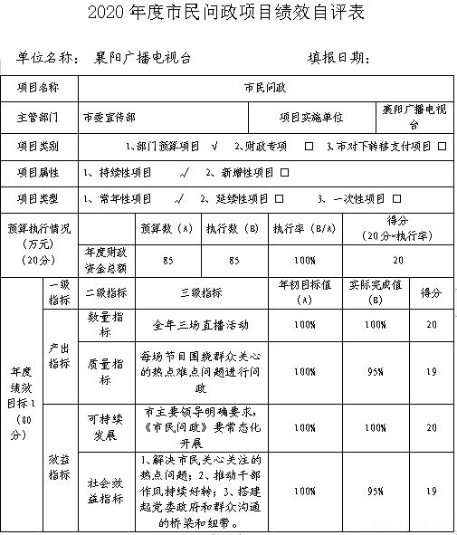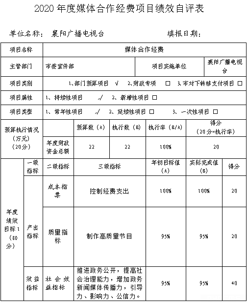 20、媒体合作经费绩效自评综述:项目全年预算数为22万元,执行数为22万元,完成预算100%。主要产出和效益:建设云上襄阳移动政务额户端,产品内容生产接入长江云移动政务新媒体平台,共享使用全省云稿库。助力襄阳市新闻宣传工作与民生、政务服务在全省乃至全国的推广和服务. 发现的问题及原因:襄阳广播电视切实建设、维护和运营好“云上襄阳”平台。同时,需要协助各地各部门完成已有“两微一端”产品的接入和新产品的定制开发,运维人员的能力及水平参差不齐。 下一步改进措施:协助各地各部门“两微一端”运维人员的培训,帮助提高能力水平。