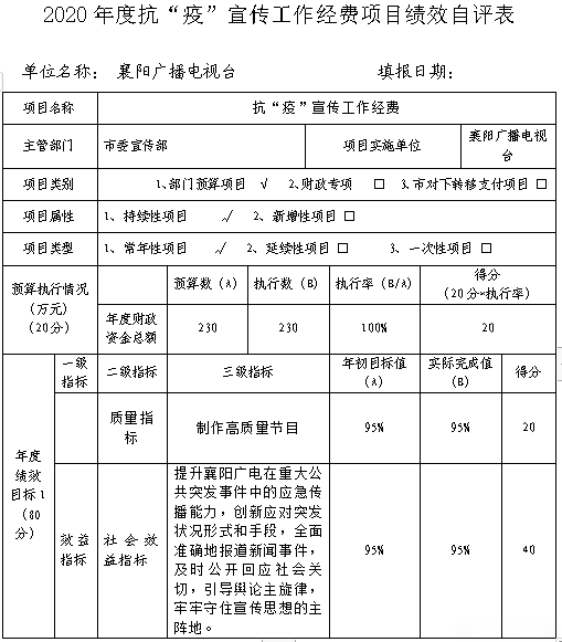18、抗“疫”宣传工作经费绩效自评综述:项目全年预算数为230万元,执行数为230万元,完成预算100%。主要产出和效益:制作高质量节目,提升襄阳广电在重大公共突发事件中的应急传播能力,创新应对突发状况形式和手段,全面准确地报道新闻事件,及时公开回应社会关切,引导舆论主旋律,牢牢守住宣传思想的主阵地。发现的问题及原因:业务涉及特殊情况下的社会资源整合,对社会留存的音视频资料评估体系不建全,社会力量参与类似突发重大项目的参与度有限。下一步改进措施:融媒体的框架下进一步探索融合社会传播力量的途径。