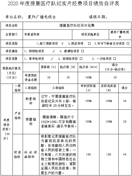 19、援襄医疗队纪实专题片制作经费绩效自评综述:项目全年预算数为20万元,执行数为20万元,完成预算100%。主要产出和效益:用影像记录援襄医疗队为襄阳抗疫做出的贡献,体现襄阳人民对两省人民的感激之情,一方有难、八方支援的同袍之情和中国特色社会主义制度优越性,凝聚全国人民抗击疫情、恢复生产的力量。发现的问题及原因:由于项目的政治意义和社会意义非常重要,同时时间比较紧,因此在项目的执行过程中,前期策划与后期执行中出现了一些偏差,在领导的支持下,我们以大局为重,全力以赴,及时纠偏,圆满地完成了任务。下一步改进措施:全面梳理各项重点工作,对项目绩效目标和指标进行认真研究和论证,确保各项目标和指标指向明确、合理可行。
