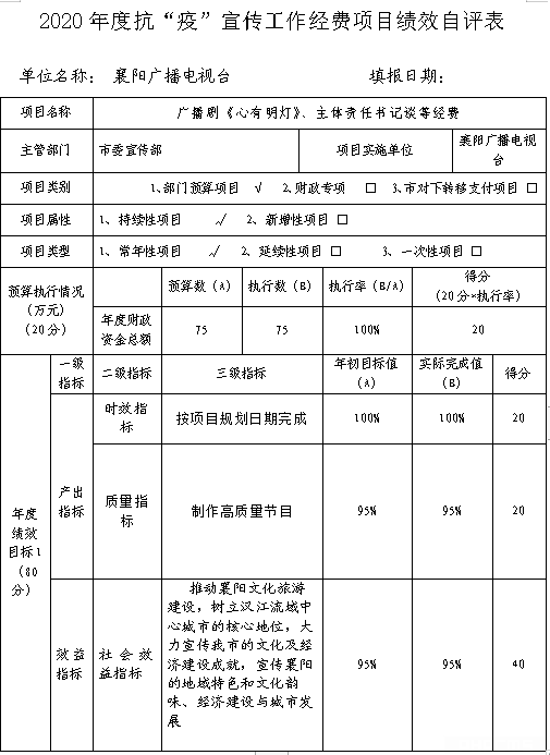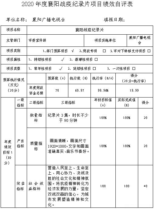 21、《襄阳 战疫》纪录片经费绩效自评综述:项目全年预算数为70万元,执行数为69.97万元,完成预算99.99%。主要产出和效益:根据襄阳市新冠肺炎疫情防控指挥部要求,由襄阳广播电视台组织创作团队,制作《襄阳抗疫》纪录片,以纪实的手法反映全市在党中央、省委、市委的正确领导下,以人民至上、生命至上为理念,实事求是、科学决策、指挥调度、发动群众、举国援助、各界同心、医护救治、社区服务、党员双报到、食物供应、复工复产、双战双赢等等各方面的抗疫故事,体现社会主义的制度优势,将伟大的抗疫精神转化为复工复产、双战双赢的力量。发现的问题及原因:业务涉及特殊情况下的社会资源整合,对社会留存的音视频资料评估体系不建全,社会力量参与类似突发重大项目的参与度有限。下一步改进措施:融媒体的框架下进一步探索融合社会传播力量的途径。