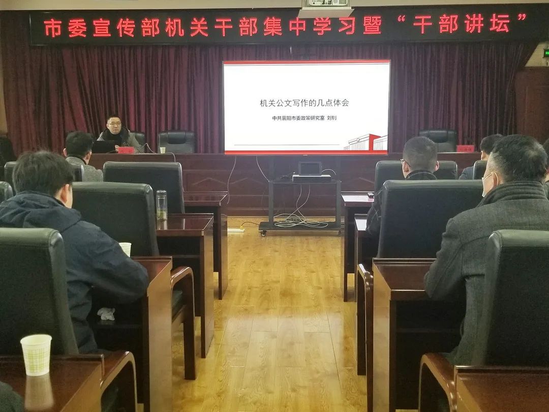 为进一步提升干部的公文写作与处理水平,促进部机关公文规范建设和工作效能的有效提升,3月25日,市委宣传部举办干部讲坛,邀请市委法规室主任杨璐、市委政研室财经政策科科长刘钊为机关干部分别作了题为《高质量做好公文制发工作》《机关公文写作的几点体会》的专题授课。